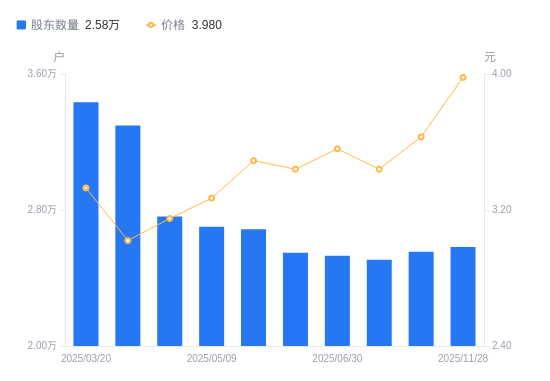 12月31日动静,数据显示,截至2025年11月28日,*ST中基A股股东总户数为2。58万户,较上期(2025年9月30日)添加279户,增幅1。09%。公司最新A股总股本为7。71亿股,此中畅通A股7。71亿股,户均持有畅通A股数量为2。99万股,较上期削减326。1股,降幅1。08%;户均持畅通A股市值11。89万元,较上期添加9268。06元,增幅8。46%。